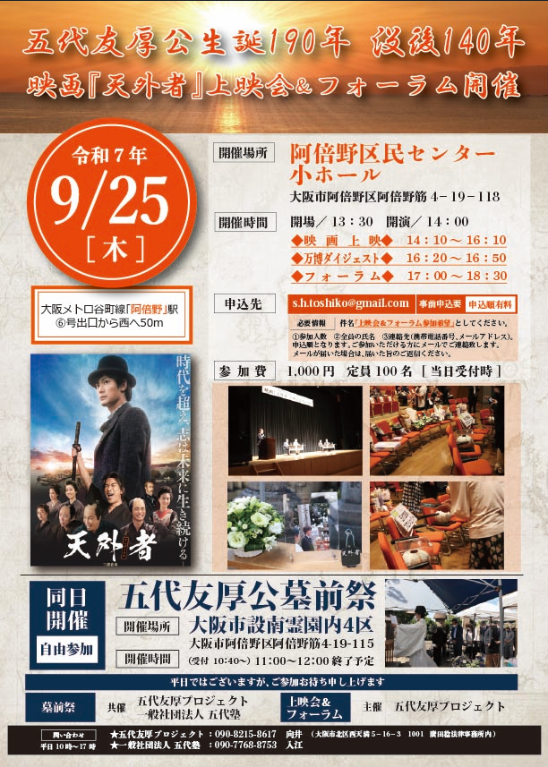 25日は墓前祭、映画上映会とフォーラム、並びに万博ダイジェストを阿倍野区民センターにて開催します。